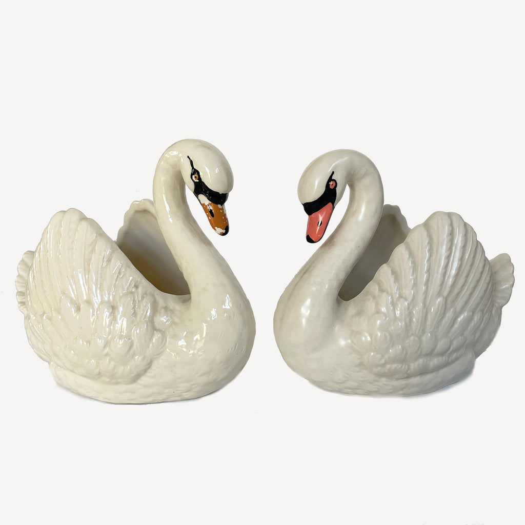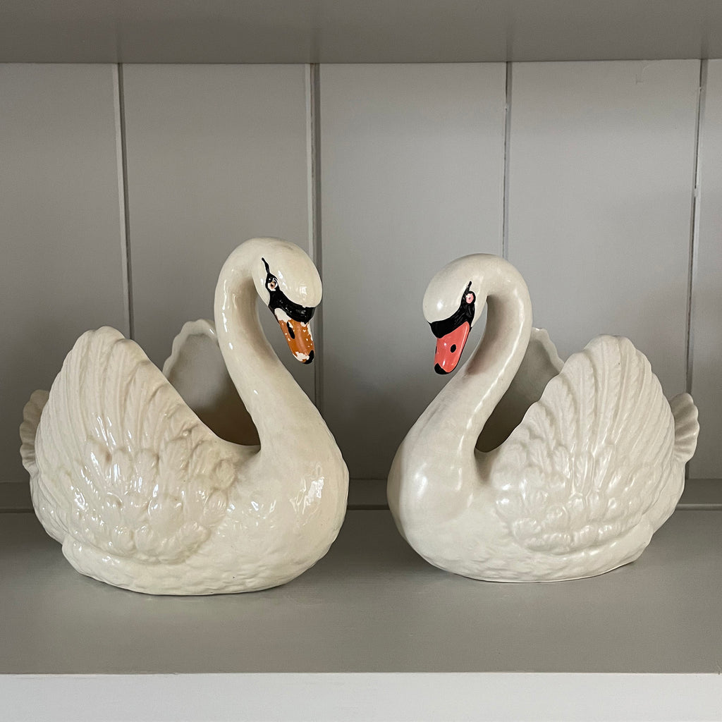 The older of the pair, this swan has a lovely all over crackling to the high shine glaze, he has lost some colour to the beak but there are no chips or cracks.