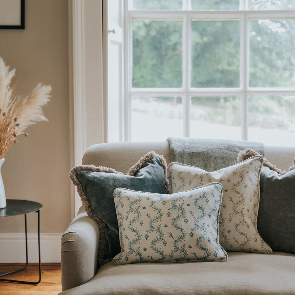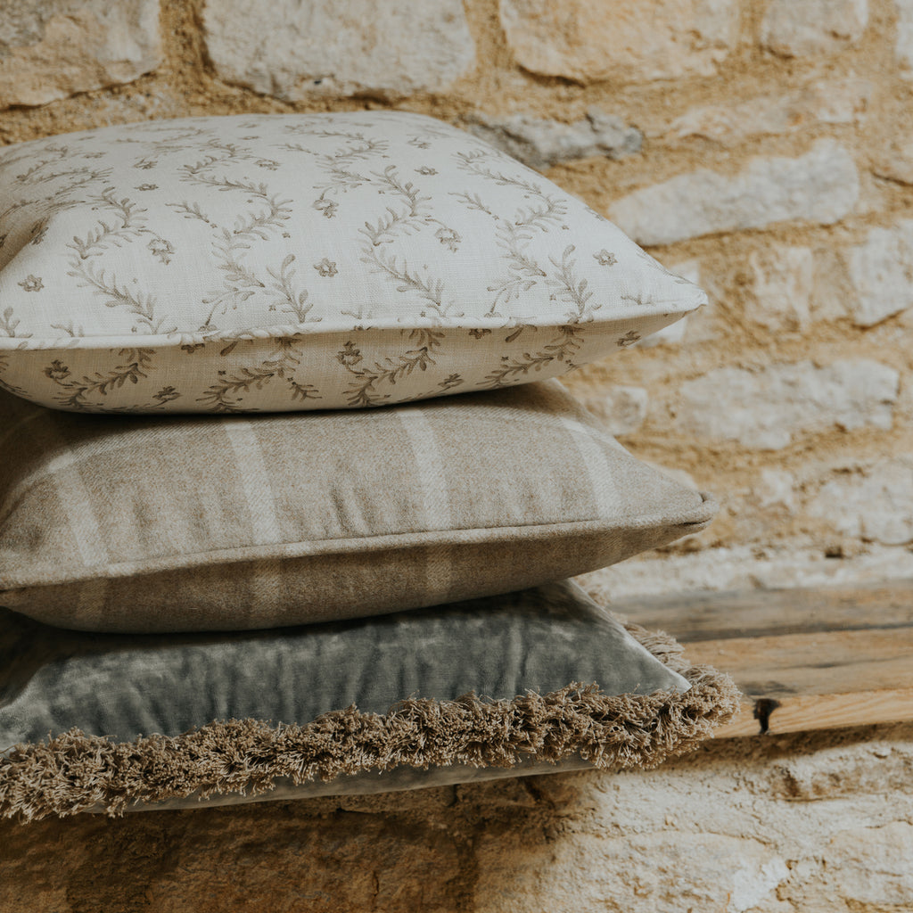 Our pretty Trellis Garden cushions are designed and hand made in our Wiltshire studio from 100% premium linen, featuring a delicate trailing vertical pattern reminiscent of traditional English gardens.